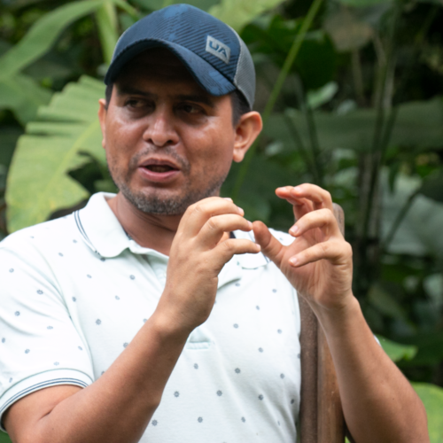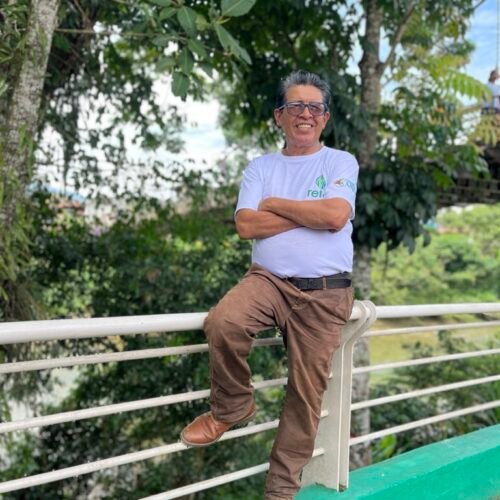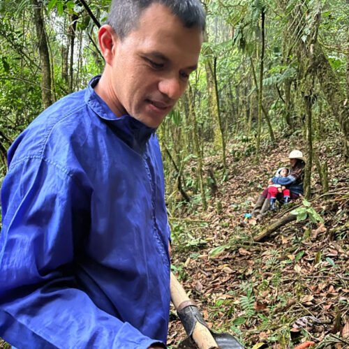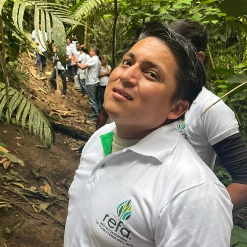Francisco es líder comunitario y promotor del proceso de Intercambio Nacional de Ecosimía. Desde los 15 años ha cultivado su pasión por los árboles, lo que lo llevó a mantener un vivero comunitario y a participar en diversos proyectos de restauración. Sin embargo, su verdadera pasión radica en el cacao. Junto a su organización, ASOANE, produce uno de los mejores cacaos nacionales, del cual además elaboran subproductos como miel y vino de cacao, aprovechando al máximo su potencial.